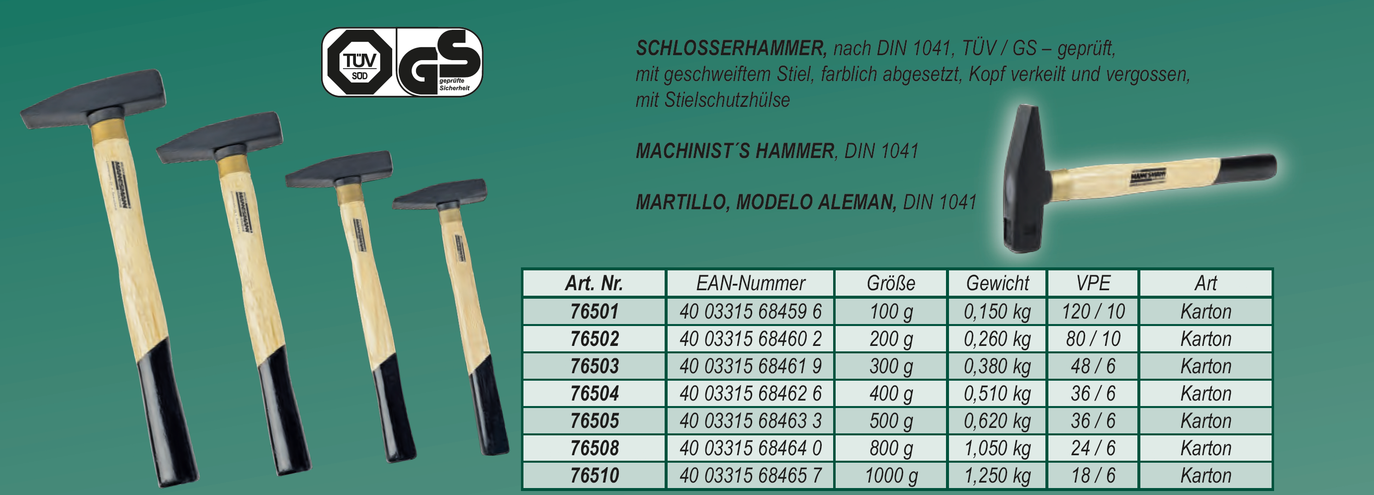 Es gibt viele Arten von Hämmern, die sich durch ihren Kopf, das Material und den Griff unterscheiden. Zu den gängigsten gehören: