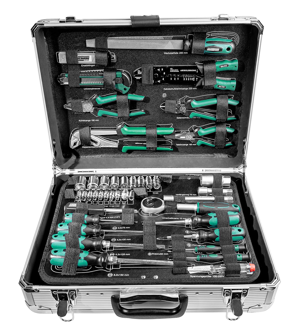Mit seinem robusten Aluminiumkoffer und dem hochwertigen Chrom-Vanadium Stahlwerkzeug bist du bestens ausgestattet. Ob zu Hause, im Garten oder in der Werkstatt, dieser Koffer lässt dich nie im Stich. Und das Beste: Du erhältst 10 Jahre Garantie auf dieses Qualitätsprodukt. Vertraue auf die TÜV/GS Prüfung und erlebe die Leistungsfähigkeit dieses Werkzeugkoffers, der dir bei jedem Projekt zur Seite steht.